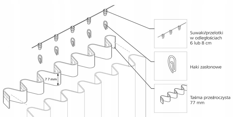 - System WAVE (na życzenie klienta - Opcja Płatna Dodatkowo dostępna na innej naszej aukcji.) - suwaki połączone sznurkiem co 6 lub co 8 cm. do falowania tkaniny + taśma do wszycia w tkaninę oraz t.z haczyki ślimaki (haki zasłonowe).